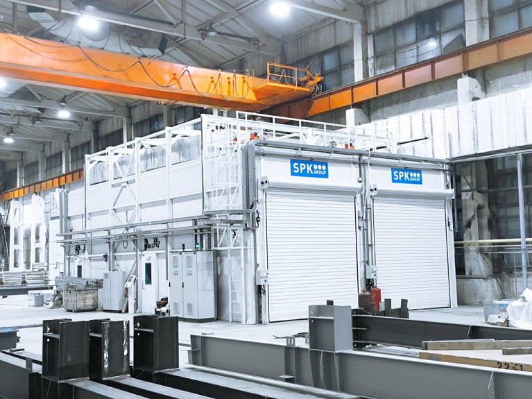 Конструкция кабины выполнена на основе прочного металлического каркаса, обшитого сэндвич-панелями толщиной 50 и 80 мм с заполнением из минеральной ваты на основе базальтового волокна. Для въезда и выезда изделий предусмотрены четыре основные подъемные роллетные ворота размером 3 500 × 3 500 мм. Дополнительно камера оснащена четырьмя сервисными дверями типа «Антипаника» размером 800 × 2 000 мм, обеспечивающими удобный и безопасный доступ персонала.